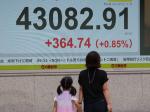 13日午前の東京株式市場で、日経平均株価は初めて4万3000円を上回り、取引時間中としての史上最高値を連日で更新した。写真は株価を示すモニター=東京都中央…
